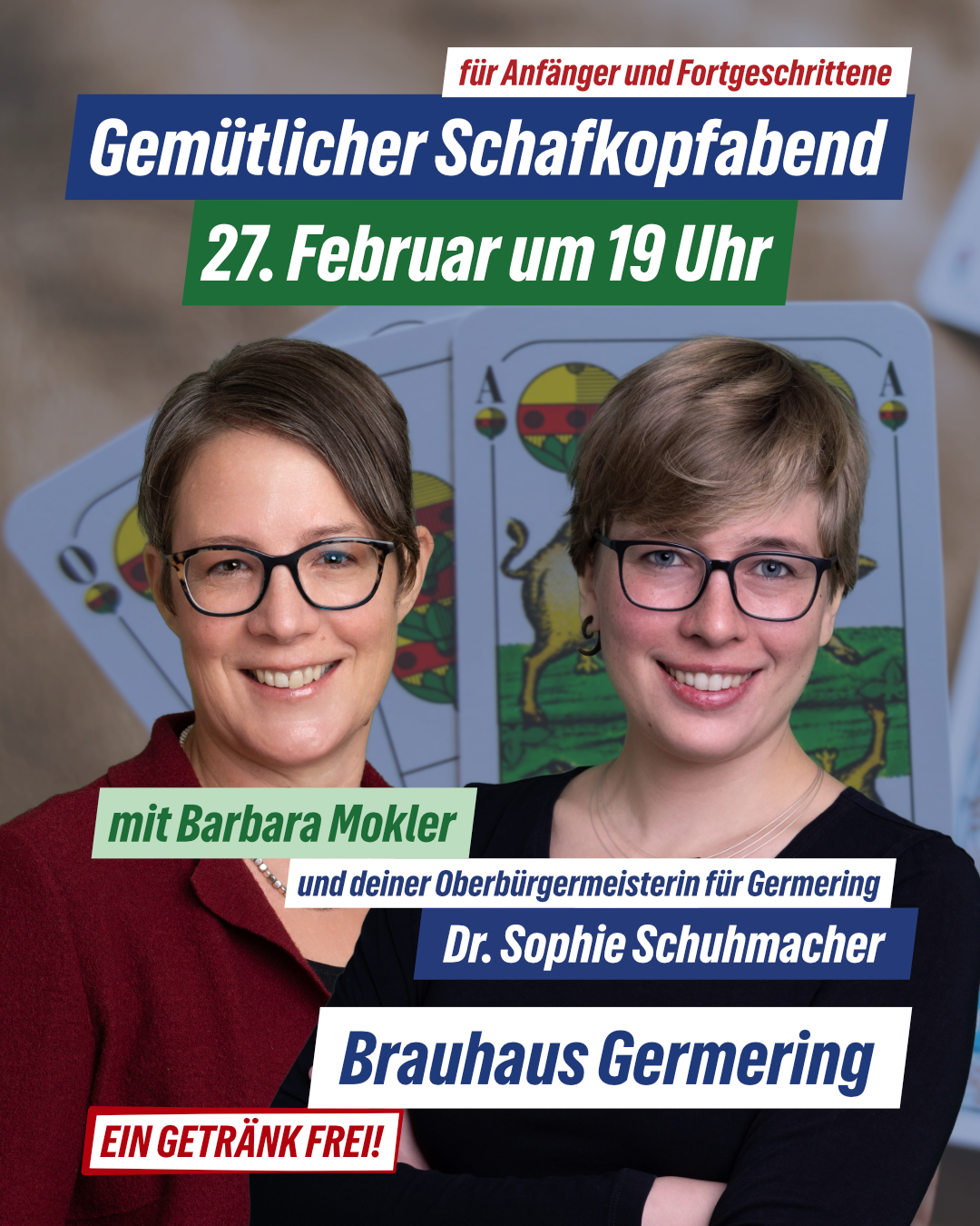 Der erste war ein Erfolg, deshalb kommt hier Runde 2: Barbara Mokler und Dr. Sophie Schuhmacher laden wieder zum Schafkopfen ins Brauhaus ein. Von kompletten Neulingen bis zu den Profis: Wir sortieren die Tische nach Vorkenntnissen, erklären bei Bedarf die Regeln ganz von vorne und loben an den Profitischen einen kleinen Preis aus. Kommt vorbei!