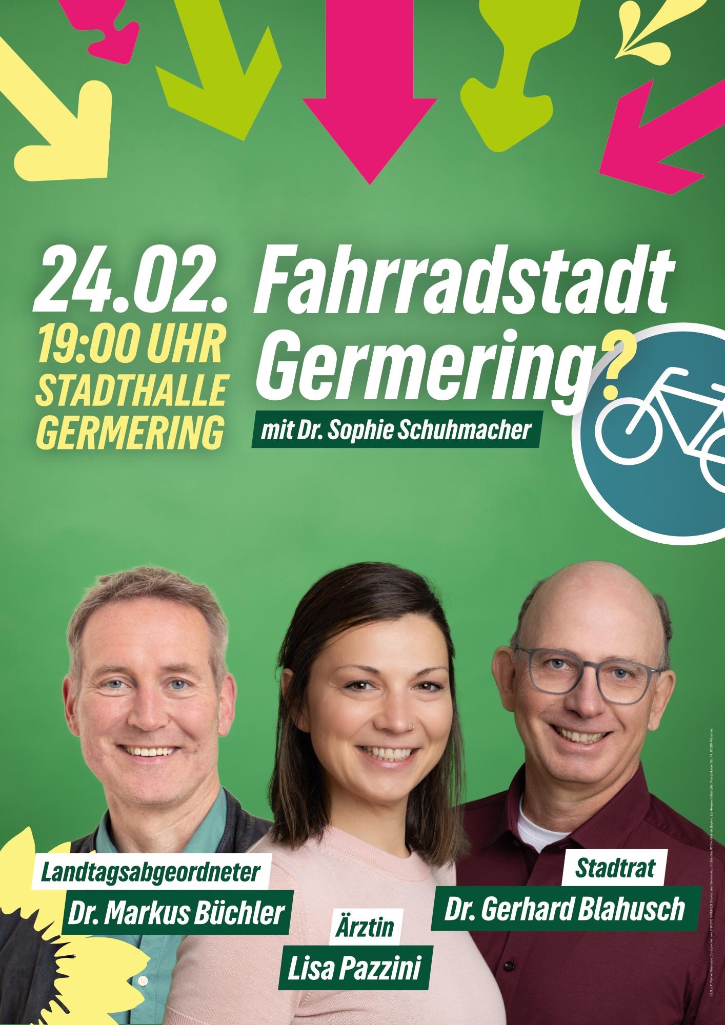 Radfahren steht für Lebensqualität, Gesundheit und nachhaltige Mobilität – doch wie sieht die Zukunft in Germering aus? Darüber möchten wir mit Ihnen ins Gespräch kommen und laden Sie herzlich ein. Ärztin und Stadtratskandidatin Lisa Pzzini, Dr. Markus Büchler (MdL) und Stadtrat Dr. Gerhard Blahusch geben spannende Impulse: von medizinischen Erkenntnissen zu Unfallrisiken über die Perspektive der Radfahrenden bis hin zu kommunalen Handlungsmöglichkeiten durch neue Regelungen der StVO. Auch OB-Kandidatin Dr. Sophie Schuhmacher wird Rede und Antwort stehen. Bringen Sie Ihre Fragen und Ideen mit und diskutieren Sie mit uns im Anschluss. Der Eintritt ist frei – kommen Sie am 24. Februar um 19 Uhr in die Stadthalle Germering (Franz-Defregger-Saal).